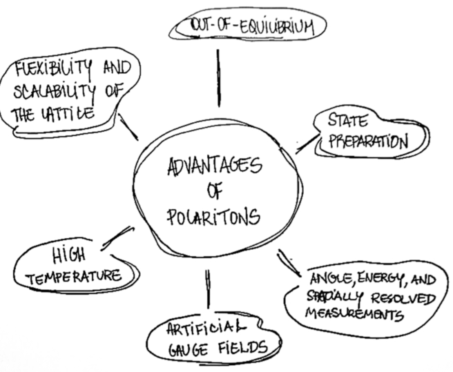 Our project aims to build a specific type of simulator made up of (exciton-)polaritons. These are pseudoparticles made of strongly interacting light (a photon) and matter (an electron-hole pair called exciton). The main difference of the polariton simulator over other platforms —such as cold atoms or superconducting circuits— is that polaritons are easily dissipated and must be externally driven, thus they are intrinsically out-of-equilibrium. This poses some great challenges but also some great advantages:
